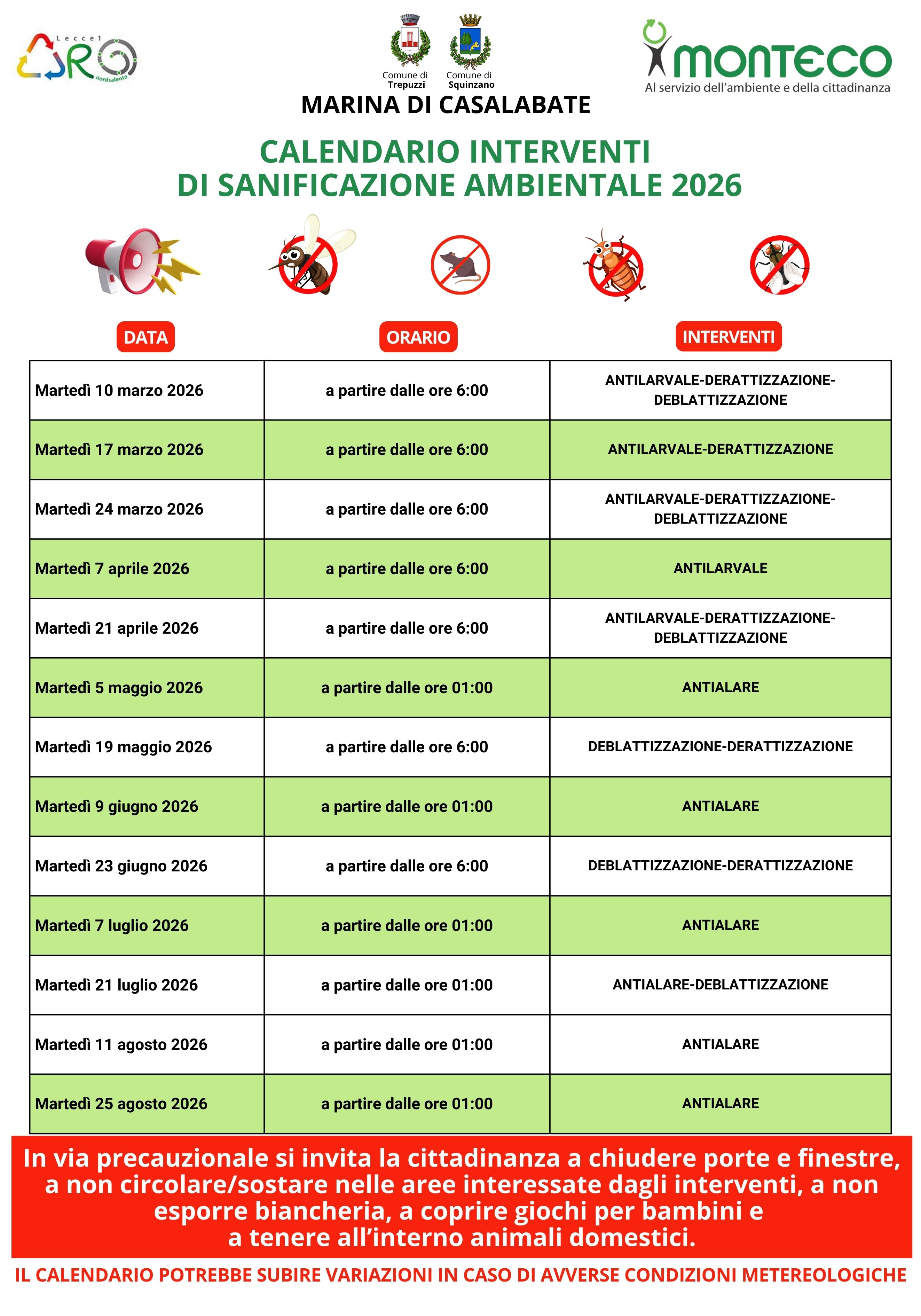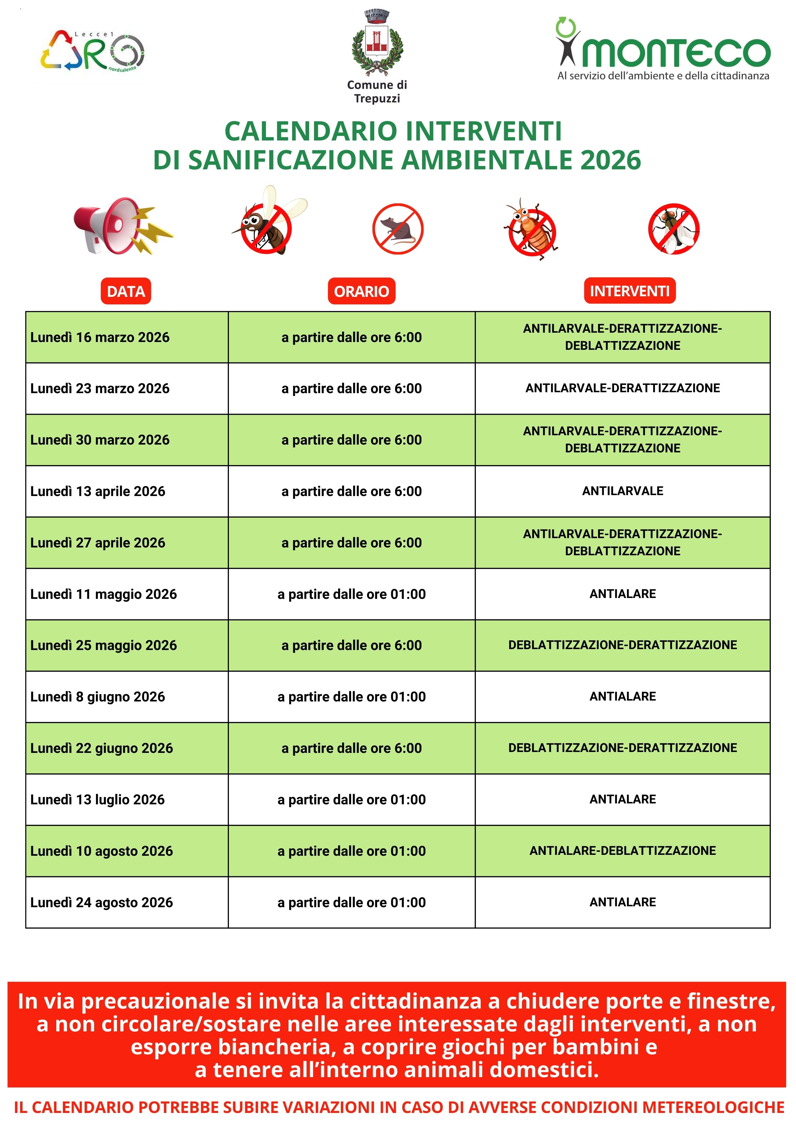 Per le date indicate nel calendario di INTERVENTI DI SANIFICAZIONE AMBIENTALE 2026, si invita tutta la cittadinanza del  Comune di Trepuzzi 𝗮 𝗰𝗵𝗶𝘂𝗱𝗲𝗿𝗲 𝗽𝗼𝗿𝘁𝗲 𝗲 𝗳𝗶𝗻𝗲𝘀𝘁𝗿𝗲, 𝗮 𝗻𝗼𝗻 𝗰𝗶𝗿𝗰𝗼𝗹𝗮𝗿𝗲/𝘀𝗼𝘀𝘁𝗮𝗿𝗲 𝗻𝗲𝗹𝗹𝗲 𝗮𝗿𝗲𝗲 𝗶𝗻𝘁𝗲𝗿𝗲𝘀𝘀𝗮𝘁𝗲 𝗱𝗮𝗴𝗹𝗶 𝗶𝗻𝘁𝗲𝗿𝘃𝗲𝗻𝘁𝗶, 𝗮 𝗻𝗼𝗻 𝗲𝘀𝗽𝗼𝗿𝗿𝗲 𝗯𝗶𝗮𝗻𝗰𝗵𝗲𝗿𝗶𝗮, 𝗮 𝗰𝗼𝗽𝗿𝗶𝗿𝗲 𝗴𝗶𝗼𝗰𝗵𝗶 𝗽𝗲𝗿 𝗯𝗮𝗺𝗯𝗶𝗻𝗶 𝗲 𝗮 𝘁𝗲𝗻𝗲𝗿𝗲 𝗮𝗹𝗹'𝗶𝗻𝘁𝗲𝗿𝗻𝗼 𝗮𝗻𝗶𝗺𝗮𝗹𝗶 𝗱𝗼𝗺𝗲𝘀𝘁𝗶𝗰𝗶.